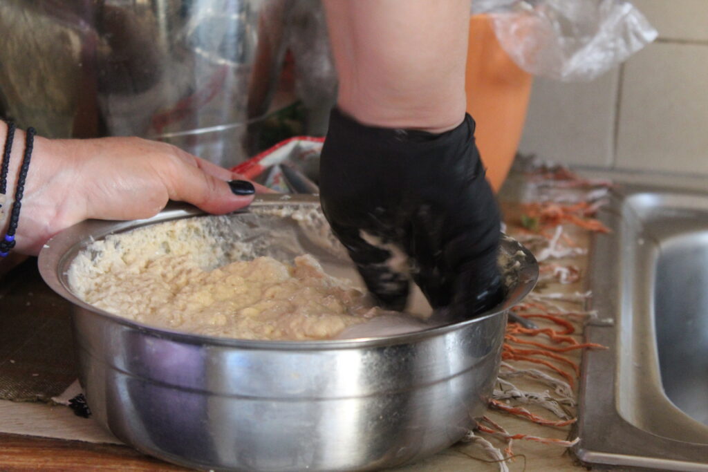 To start, lard is incorporated into the flour and semolina mixture by rubbing it in, creating a texture similar to sand. Next, sugar and aromatic spices such as mahlab, cinnamon, and cloves are added. Separately, Anari cheese and the sourdough starter are dissolved in warm milk before being mixed into the flour. No water is used in this recipe – traditionally, goat’s milk was preferred, as most families had their own animals, but today, cow’s milk is commonly used.